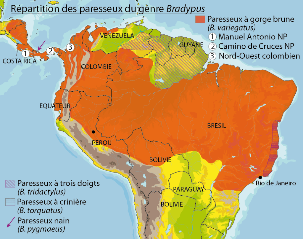 – le paresseux tridactyle (Bradypus tridactylus) : c’est l’espèce qu’on trouve dans les Guyanes. Elle est très proche de la précédente mais avec une répartition différente.