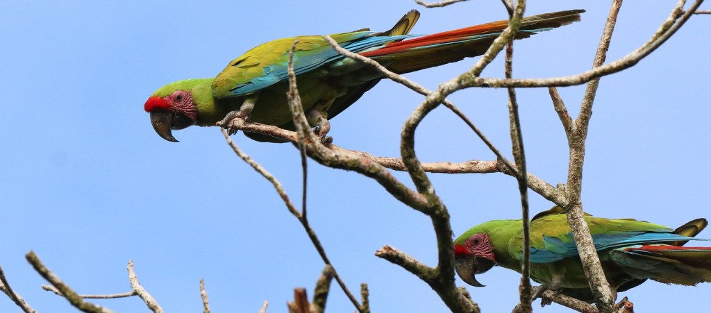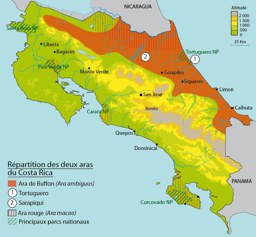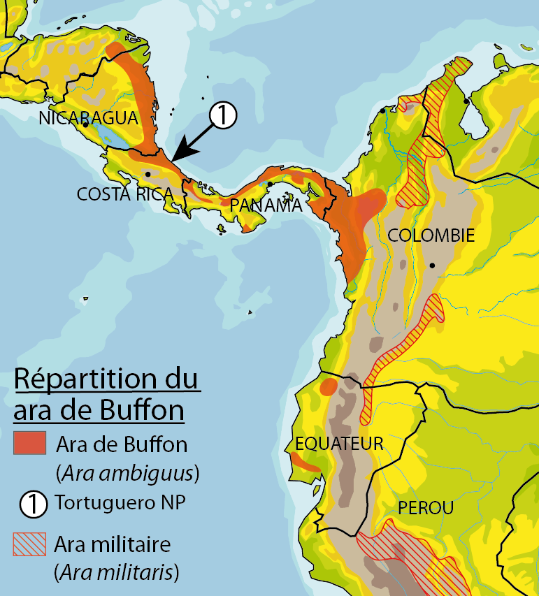 Le ara rouge a une répartition plus complexe, mais compte tenu de l’inaccessibilité de la zone Nord-Est (sauf partir en trek à l’aventure), le naturaliste amateur ne le verra généralement que sur la côte Pacifique.