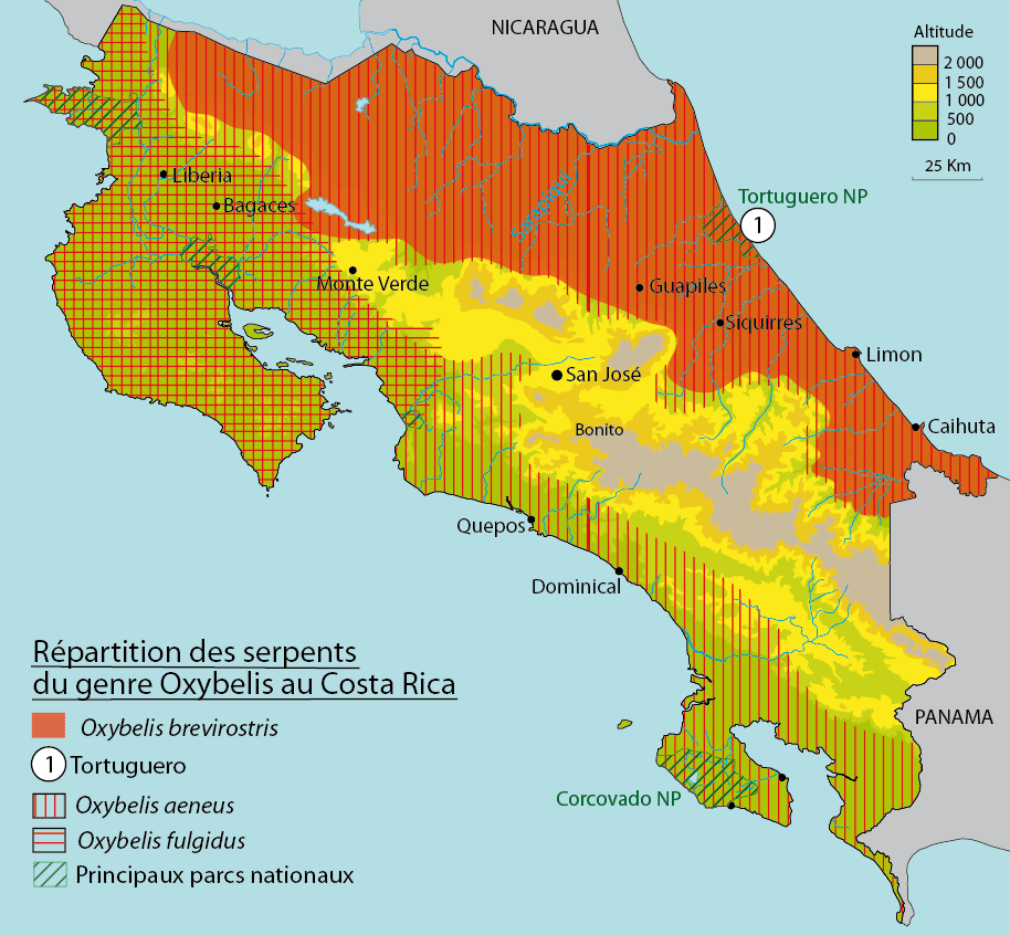 – Oxybelis fulgidus est vert mais occupe que le Nord-Ouest du Costa Rica.