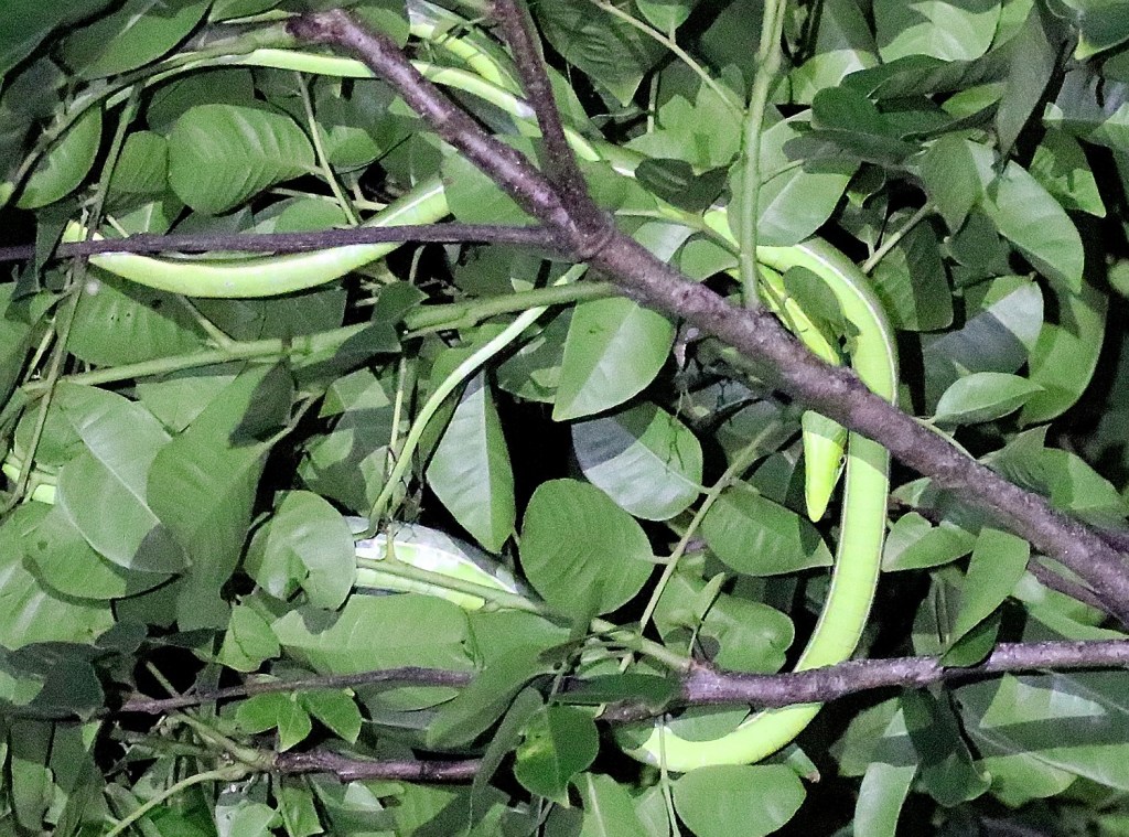 Pour trouver ce serpent, il faut chercher de nuit avec une lampe torche. Il dort en effet enroulé sur les feuillages généralement entre 1 et 3 m de hauteur. A l’éclairage de la torche, son ventre parait vert fluo et se détache assez nettement du feuillage. Eclairé, il reste immobile. En bougeant le feuillage tout près de lui, il avancera discrètement.