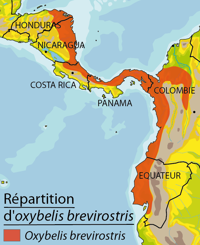 Oxybelis brevirostris est présent depuis l’Est du Honduras jusqu’au Sud de l’Equateur. Il n’est présent que sur la façade des Caraïbes dans l’essentiel de l’Amérique centrale. En Amérique du Sud, sa répartition est stoppée par la Cordillère des Andes. L’espèce ne dépasse pas les 1200 m d’altitude au Costa Rica.