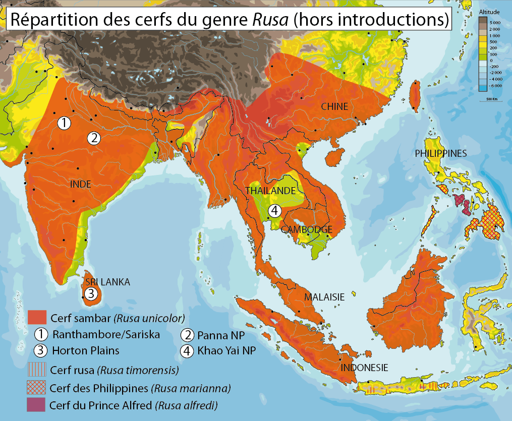 Le cerf sambar est largement réparti sur la quasi totalité de la péninsule indienne et la péninsule indochinoise. Il laisse la place à l’Est, aux autres espèces du genre Rusa.