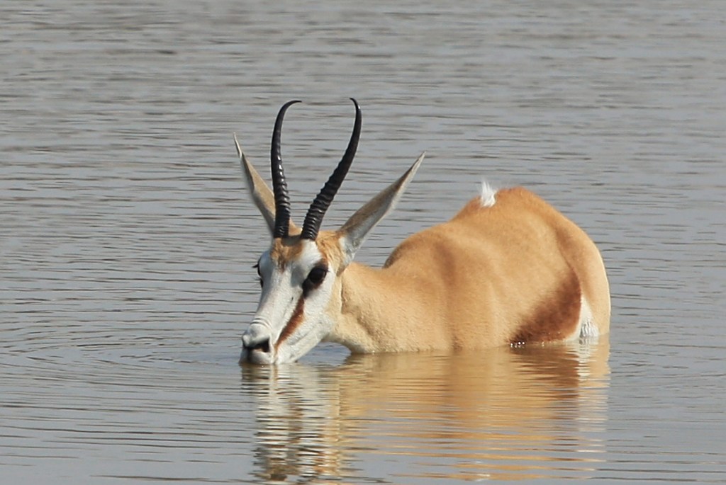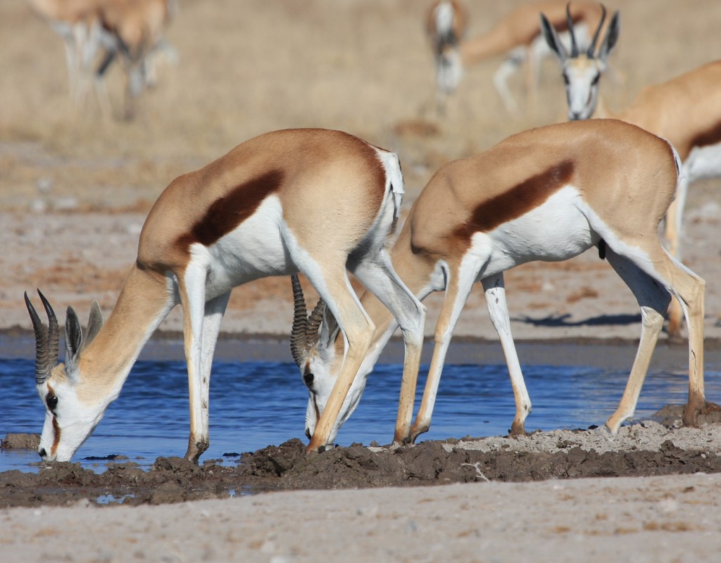 Les springboks résistent très bien à la sécheresse. Néanmoins, tant que l’eau est disponible, ils en profite comme les autres antilopes. Remarquer ici la tache blanche au dessus de la queue. C’est une poche avec des poils que l’animal hérisse quand il est inquiet.