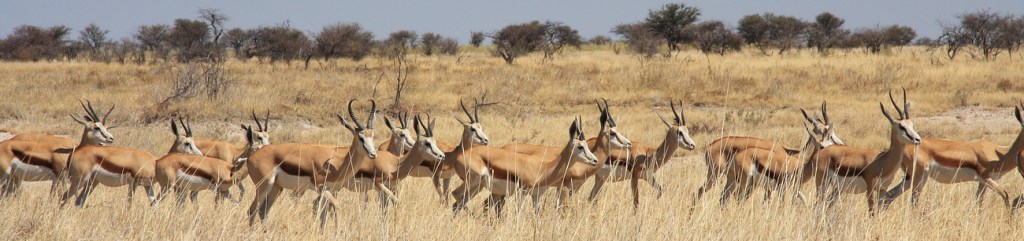 On voit rarement un springbok seul. Ici, le troupeau, essentiellement constitué de femelles, rejoint un point d’eau.