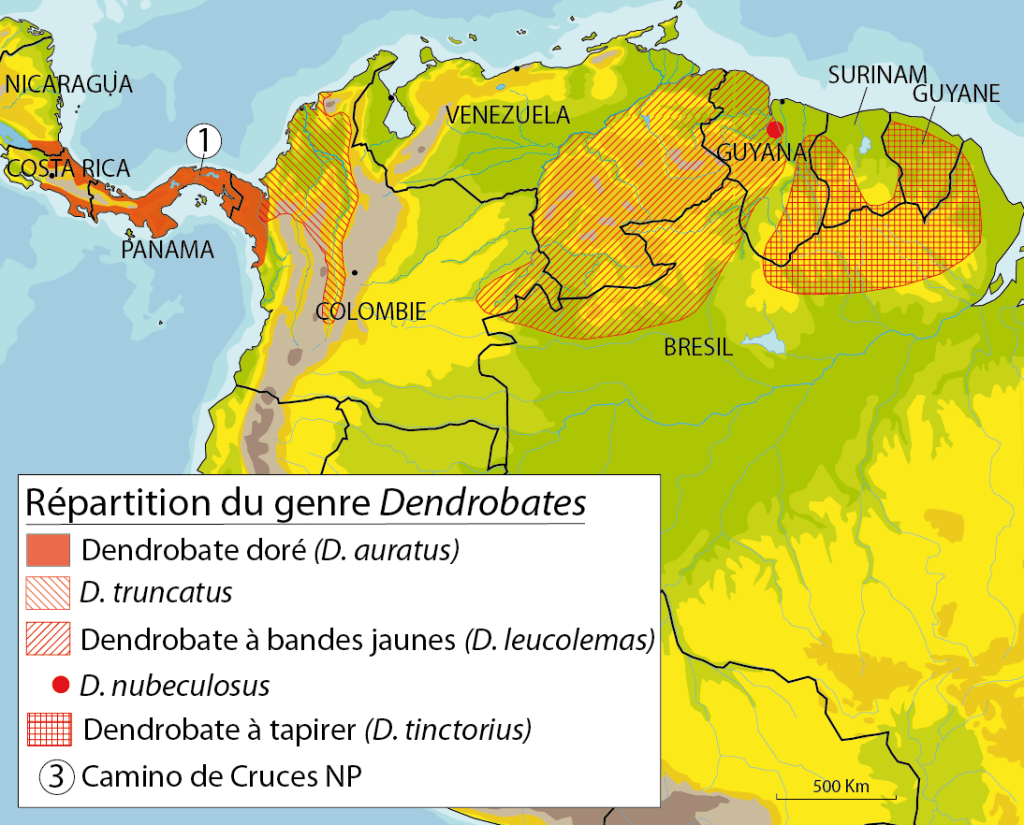 Le dendrobate doré est l’unique membre du genre Dendrobates présent en Amérique central. Il est réparti de l’extrême Sud du Nicaragua à l’extrême Ouest de la Colombie. Il a également été introduit à Hawaï, sur l’île de Oahu, dans les années 1930. Il s’agissait de contrôler les insectes invasifs… Ca n’a pas marché. On ne peut pas le confondre avec une autre espèce sauf en Colombie, dans la petite zone de contact avec D. truncatus.