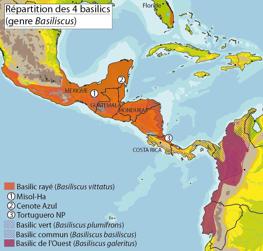 – 1 : Misol-Ha (Mexique) : Misol-Ha est une cascade touristique situé au Chiapas, entre le célèbre site archéologique de Palenque et les cascades d’Agua Azul. En aval de la cascade, en longeant la rivière, on verra facilement des basilics rayés. Sur le site de cascades d’Agua Azul, on peut aussi en trouver en amont des cascades à condition de marcher suffisamment pour s’éloigner des touristes.