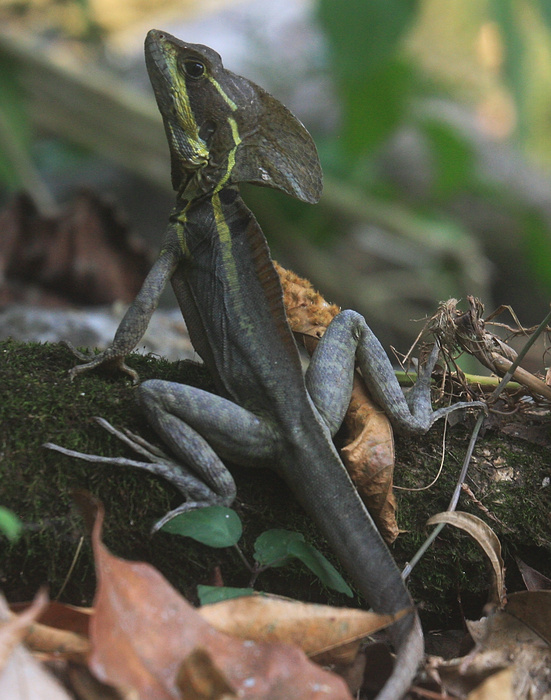– le basilic vert (basiliscus plumifrons) : c’est le plus gros photogénique (jusqu’à 90 cm pour les vieux mâles). Voir l’article Basilic vert.