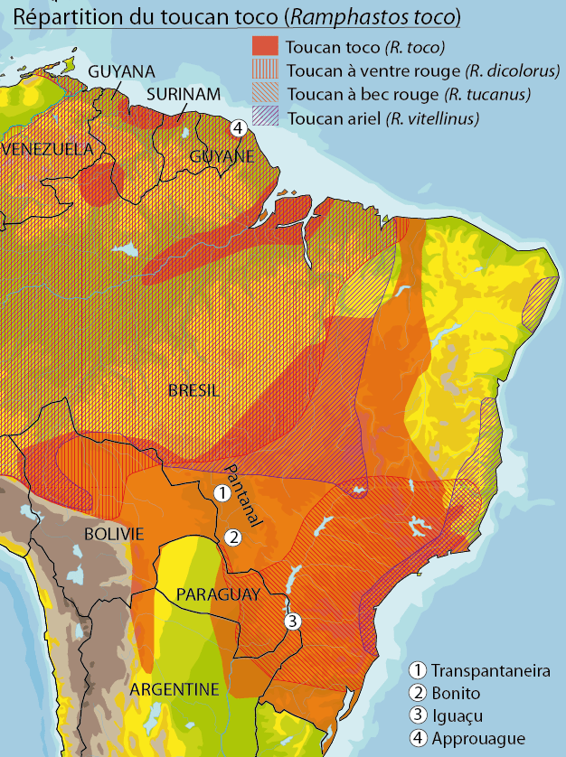 – 2 : les campagnes autour de Bonito (Brésil) : cette région, au Sud du Pantanal, est moins visitée pour sa faune. Cependant, en profitant des merveilles naturelles du secteur, on aura régulièrement l’occasion de repérer des toucans tocos.