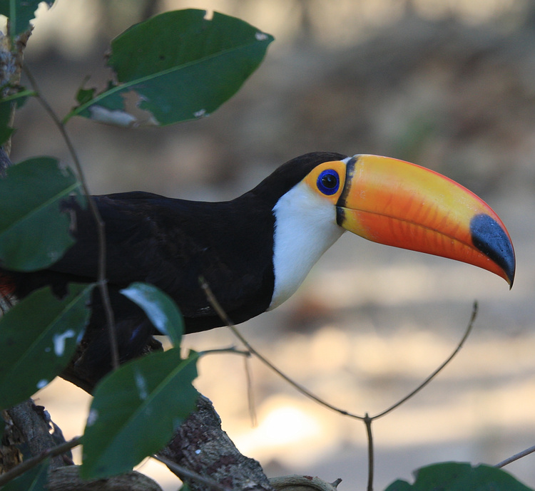 Le toucan toco est le seul grand toucan avec un bec orange « coucher de Soleil ». Le tour de l’iris bleu foncé permet également de le reconnaître immédiatement.