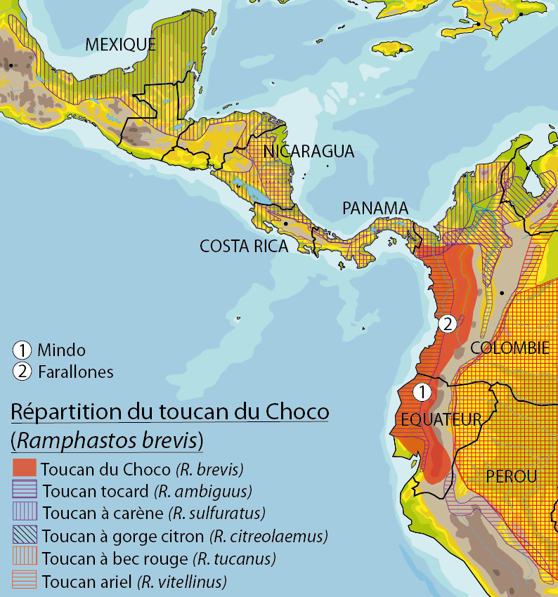 Le choco, c’est le nom de la large bande littorale Pacifique allant de la Colombie à l’Equateur. Le toucan du Choco porte bien son nom puisque sa répartition ne dépasse guère cette bande littorale.