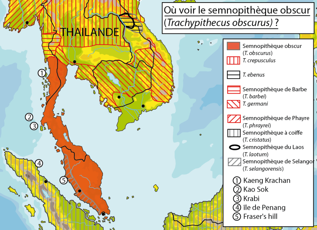 – Trachypitecus germani ne présente pas la même répartition (voir la carte ci-dessous) et n’a pas non plus le tour des yeux aussi blanc.