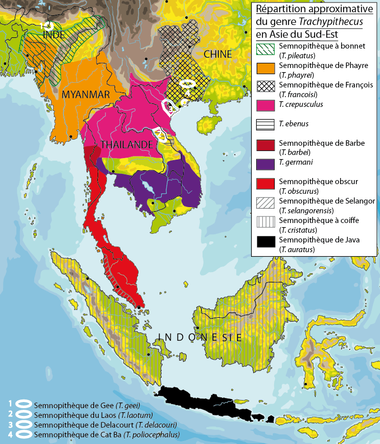 – le semnopithèque de Barbe (Trachypithecus barbei) est assez proche. Il est mal connu. Sa répartition est différente (voir la carte ci-dessous) mais il faut se méfier au Nord de la péninsule thaïlandaise.