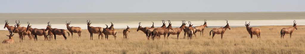 – 6 : Etosha NP (Namibie) : On ne verra pas souvent venir boire des bubales au point d’eau… en fait, je n’ai jamais vu de bubales boire… mais dans les zones semi désertiques aux abord du Pan, il y a des troupeaux.
