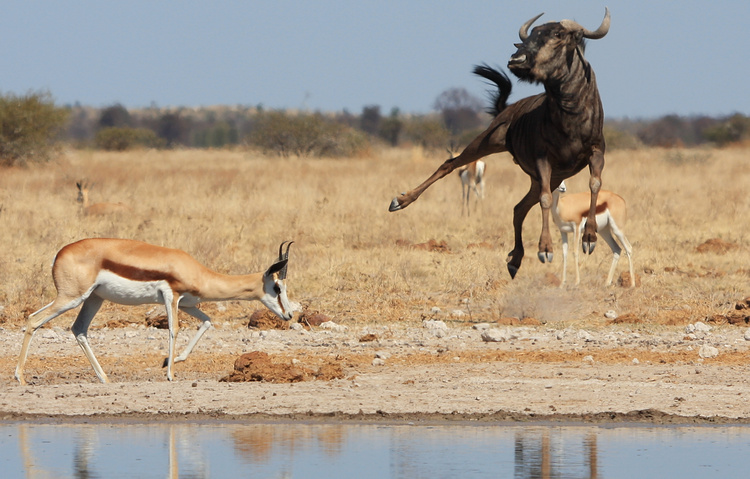– 4 : Etosha NP (Namibie) : Etosha se prête particulièrement à l’attente près d’un point d’eau. Cette stratégie ne fonctionne pas bien avec le gnou et les antilopes qui lui sont proches (Damalisques et bubales) car ils ne viennent pas boire quotidiennement. On aura plus de chance d’en voir en longeant le pan et les secteurs dégagés de l’Ouest du parc.