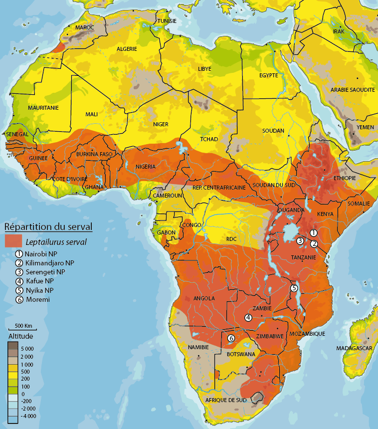 – 2 : le mont Kilimandjaro (Tanzanie) : le serval est souvent vu lors des safaris de nuit sur les pentes inférieures du Kilimandjaro à Simba Farm, à Ndarakwai Ranch et parfois sur la route menant au plateau de Shira.