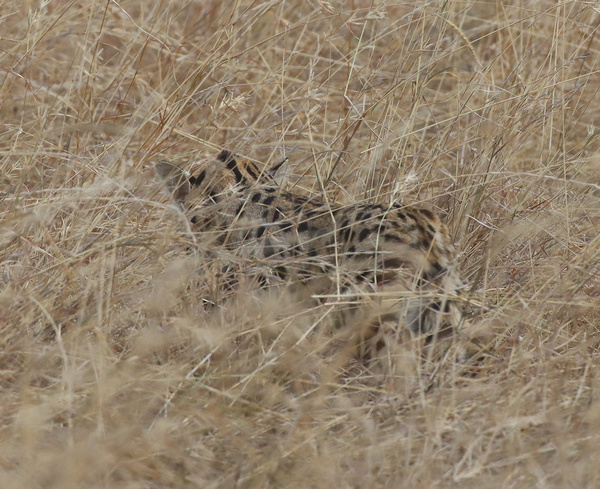 Environ une heure avant le couché du Soleil, ce serval était en vadrouille à la recherche d’une proie. Il était à faible distance (la photo est prise avec un zoom 135 mm). L’observation a duré plus d’un quart d’heure et le félin était indifférent aux observateurs.
