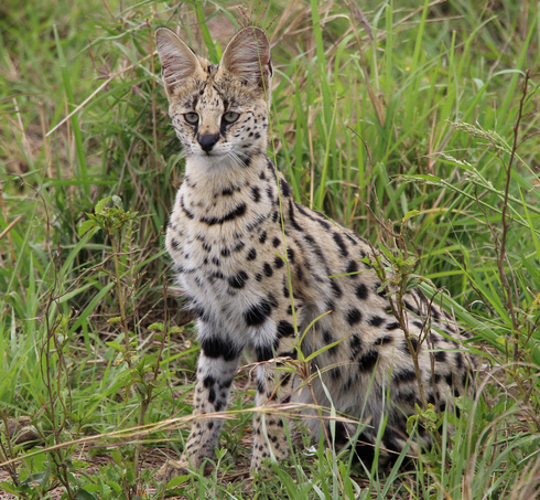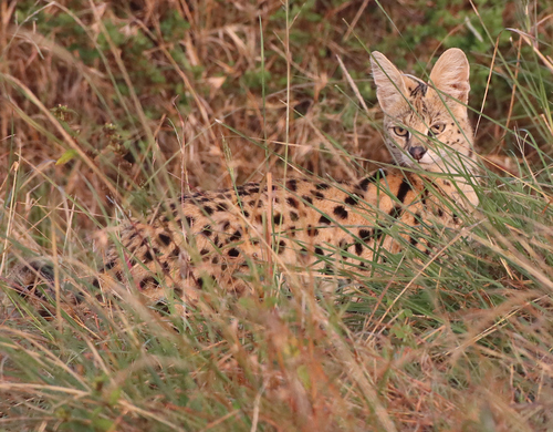 La hauteur au garrot du serval est de 60 cm en moyenne. Il passe facilement inaperçu dans les hautes herbes ; Mara Triangle ; Kenya (août 2025).