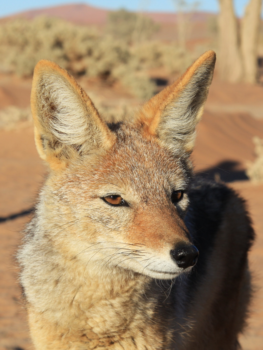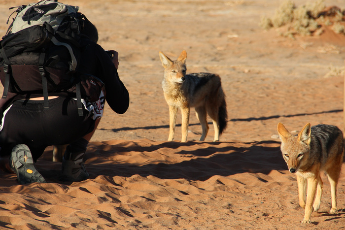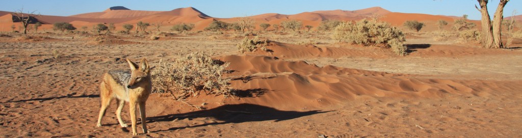 C’est en bordure de zone désertique qu’on observe le plus facilement le chacal à chabraque. A certains endroits, ils sont presque familiers. Ici, dans les dunes de Sossulvei, ils s’approchent des touristes sans aucune crainte.