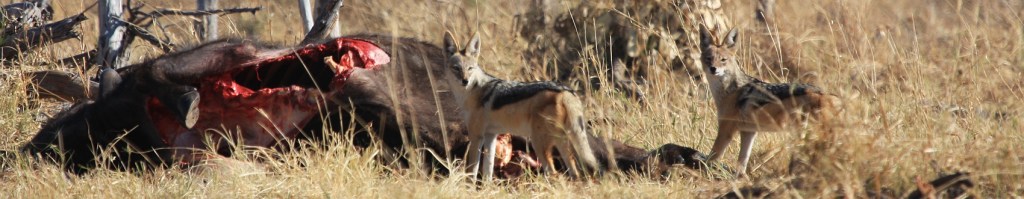 Les lions ne sont plus là. Les hyènes tachetées pas encore. Les chacals sont très opportunistes. Leur alimentation va des petits rongeurs aux jeunes ongulés et s’étend aux charognes et aux déchets humains animaux ou végétaux. Ici, le repas est servi, mais ces chacals sont inquiets car les lions et les hyènes ne sont probablement pas loins et ce sont leurs prédateurs.