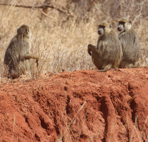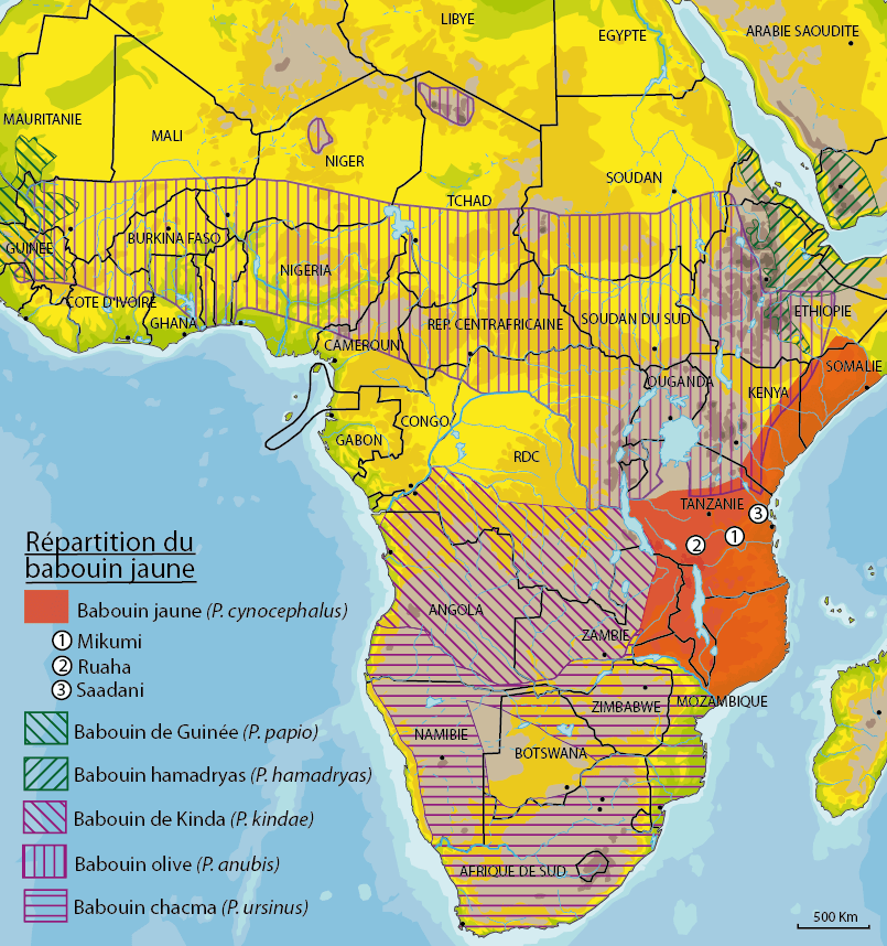 Les nombreuses données naturalistes du Kenya sont suspectes car la zone d’hybridation avec le babouin olive atteint le Tsavo au Sud. Au Kenya, on ne peut être certain de l’espèce guère que dans les zones protégées du littoral.