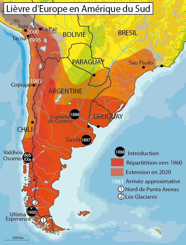 A partir des foyers argentins et chiliens, le lièvre d’Europe a colonisé presque tout le Sud du continent :