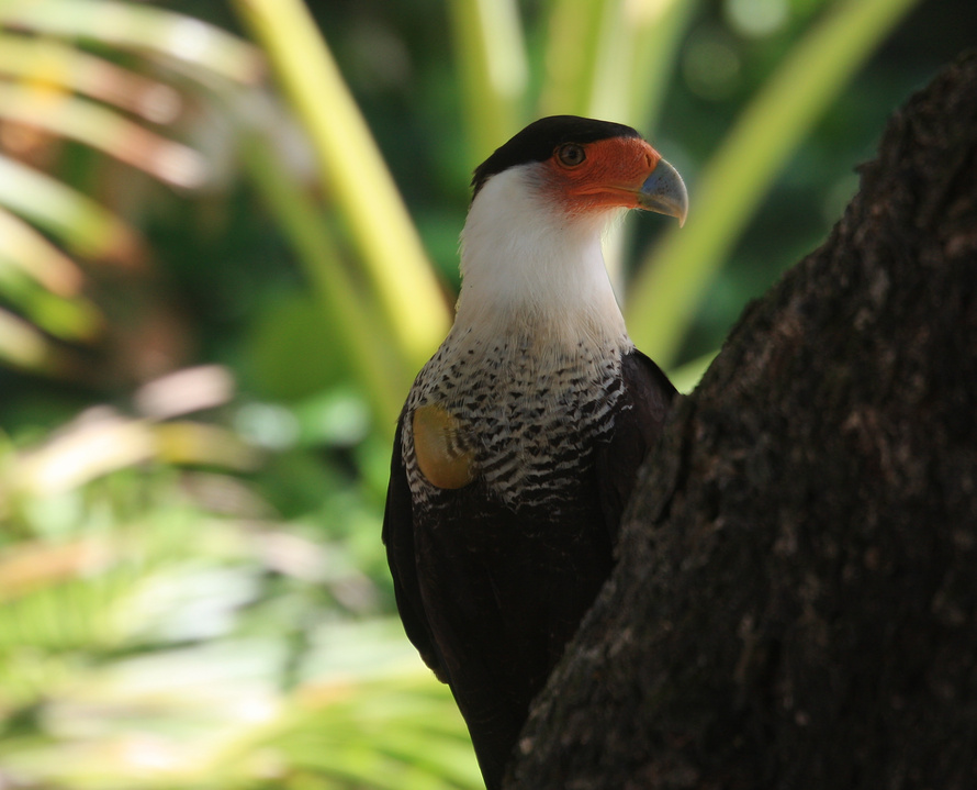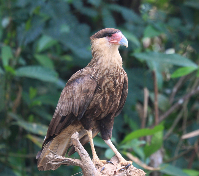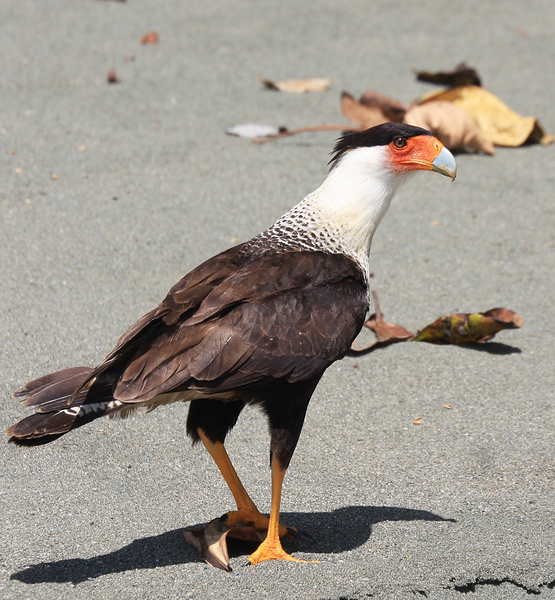 Ce caracara est un juvénile car sa couleur est encore brune (elle va foncer pour être presque noire à l’âge adulte) et la cire du bec encore grise autour des narines (elle va devenir orange).