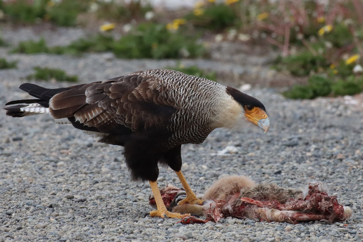 Ce caracara, de la sous-espèce C. p. plancus, profite d’un lièvre d’Europe (Voir l’article Lièvre d’Europe en Patagonie) écrasé par un véhicule.