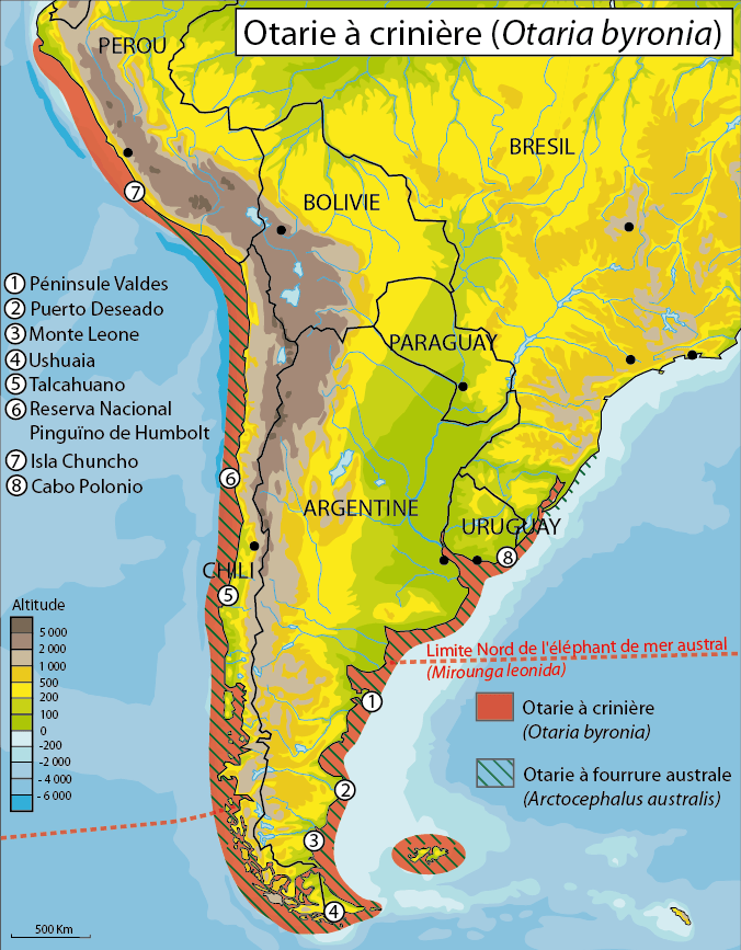 L’otarie à crinière est présente sur les littoraux du Pérou, du Chili, de l’Argentine, de l’Uruguay et de l’extrême sud du Brésil. Sa répartition est très proche de celle de l’otarie à fourrure australe (arctocephalus australis). En Patagonie, l’éléphant de mer austral (Mirounga leonida) est également présent.