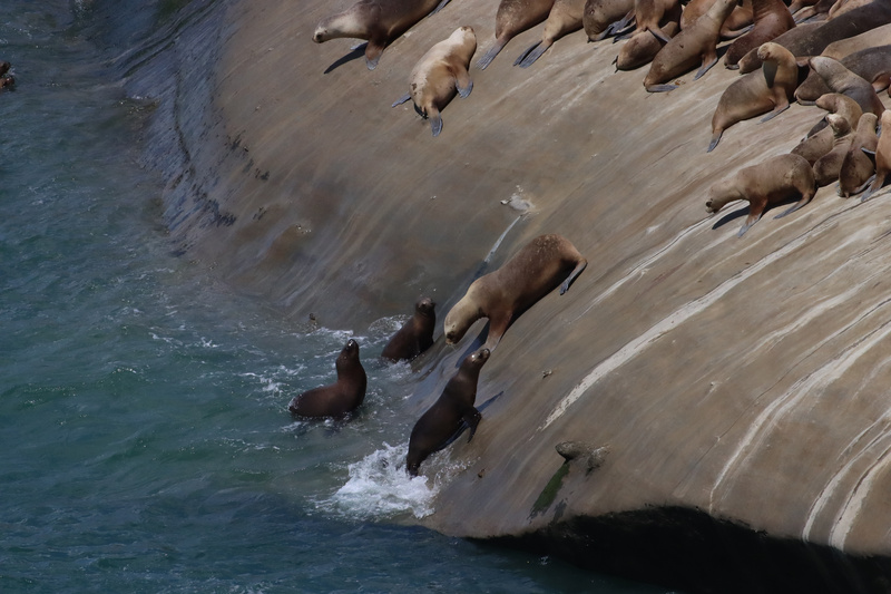 Certaines otaries s’y prennent à plusieurs reprises avant de parvenir à escalader cette côte glissante.