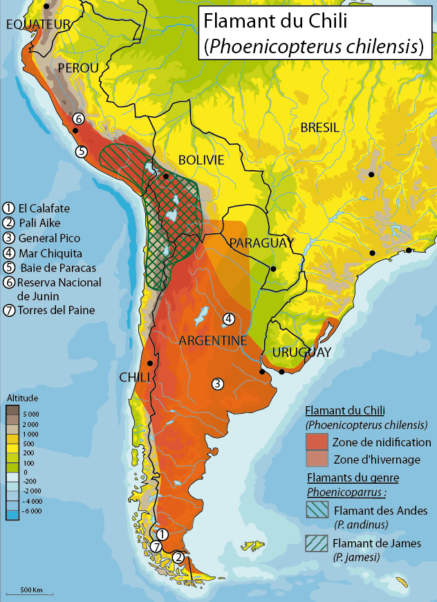 Le flamant du Chili est l’espèce de flamants la plus répandue et la plus commune en Amérique du Sud. Il est présent dans presque toute l’Argentine, dans les Andes boliviennes, péruviennes et du centre du Chili. On le trouve aussi parfois sur les littoraux en Equateur, en Uruguay et à l’extrême sud du Brésil.