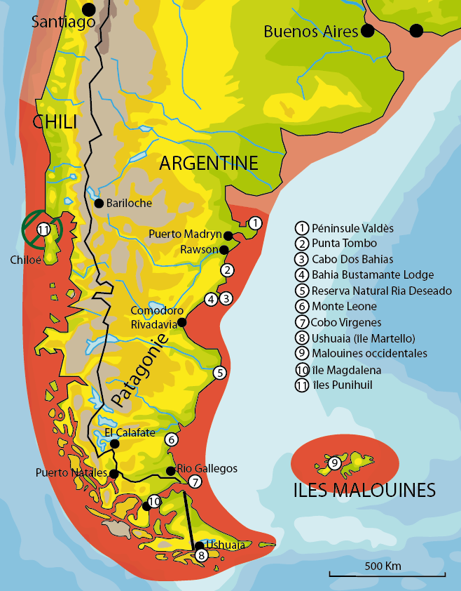 – 1 : Péninsule Valdès (Argentine) : il faut rejoindre le secteur Nord de la péninsule et notamment l’Estancia San Lorenzo. Il y aurait 600 000 manchots ici. Ce n’est pas le meilleur site mais pour ceux qui ne descendent pas plus au Nord en Patagonie, c’est intéressant.