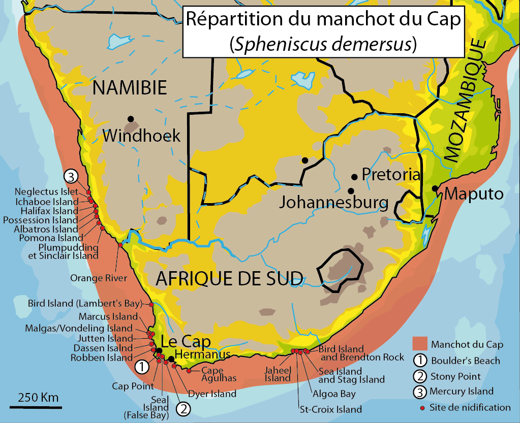 A une échelle plus fine, les sites de nidifications sont constitués de 24 îles (2/3 en Afrique du Sud) et 4 sites continentaux.