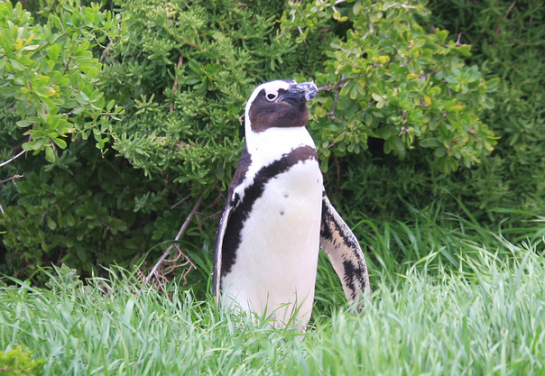 Ce manchot du Cap est dans le fynbos, la végétation au Sud de l’Afrique du sud. Ce n’est pas l’habitat qu’on imagine pour un manchot.