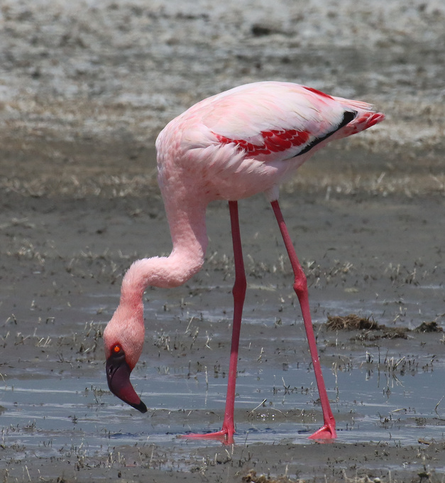 – le seul flamant qui a le bec entièrement foncé : la couleur foncé entoure également l’oeil qui est bien rouge. Ce bec, bien plus que sa taille, permet de le déterminer.