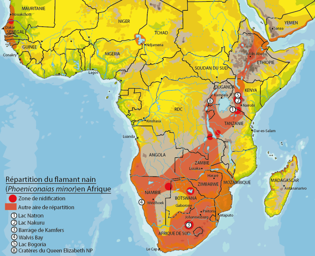 – l’Afrique de l’Est (Tanzanie, Kenya surtout) : c’est 4/5 des flamants nains de la planète (environ 2 millions).