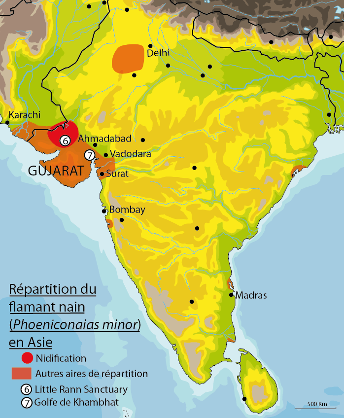 – 7 : Golfe de Khambhat (Inde) : c’est une façon de découvrir les flamants nains en partant à l’aventure. Les flamants nains sont très nombreux au Nord-Ouest du golfe en période de nidification. En dehors de cette période, tout le littoral ouest convient pour les chercher.