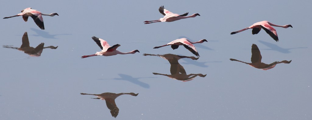 Au lac Natron, on voit des oiseaux s’envoler pour changer de secteur, ou revenir, sans raisons apparentes.