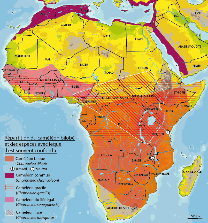 La carte suivante montre la répartition de quelques espèces dont les 3 présentes en Tanzanie. Voir aussi l’article Caméléon bilobé.