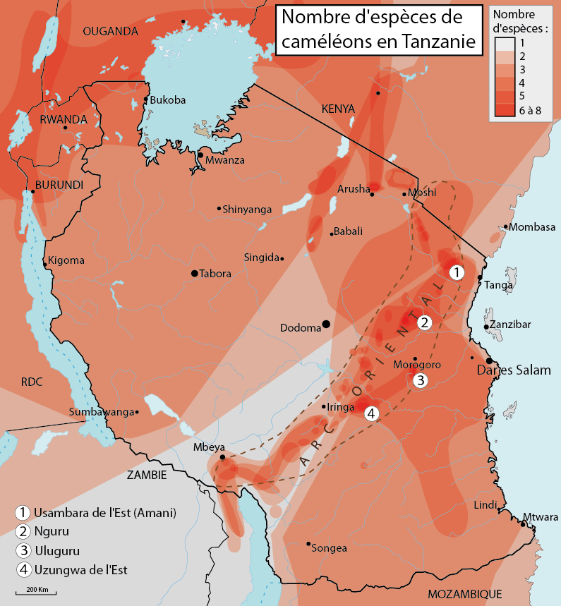 Le nombre d’espèces devient plus important dans les zones montagneuses et en particulier dans l’arc oriental (en pointillé sur la carte). Certains sites de montagne abritent ainsi jusqu’à 8 espèces de caméléons appartenant à 5 genres différents. Ainsi, l’Est de l’Uzungwa (4), l’Uluguru (3), le Nguru (2) et l’Est des Usambara (1) sont des massifs particulièrement intéressants pour la recherche des caméléons.