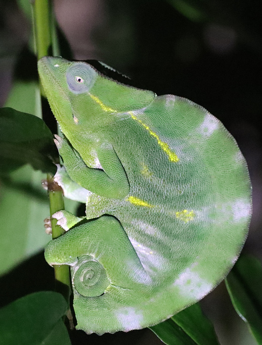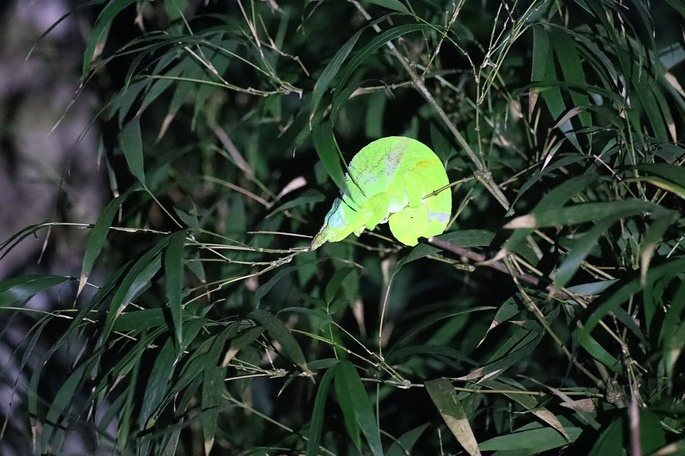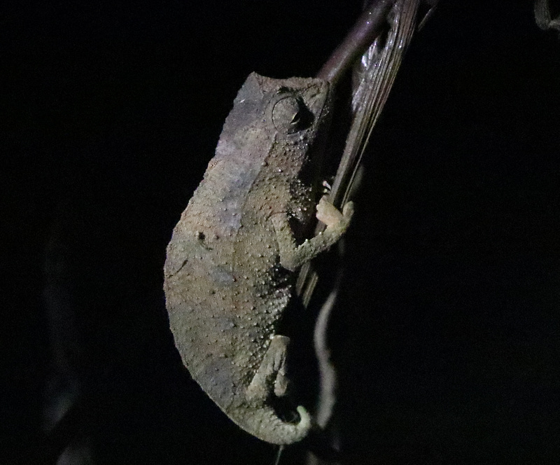 Les caméléons trouvés peuvent être réveillés ou endormis. Dans les deux cas, ils restent généralement immobiles. Certains individus sont repérés trop haut (amener des jumelles) ou dans des zones très feuillus de sorte qu’il n’est pas facile de les photographier. Si vous avez du temps, repérez l’emplacement précis et revenez voir en journée. Le caméléon se sera déplacé mais il ne sera pas loin.