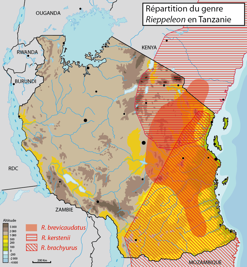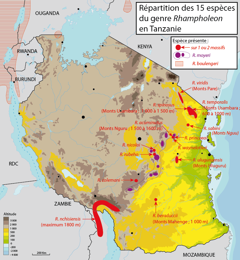 En Tanzanie, leur répartition n’est jamais très étendue (voir la carte ci-contre). En dehors de Rhampholeon boulangeri, toutes les espèces sont sur les montagnes de l’arc oriental.