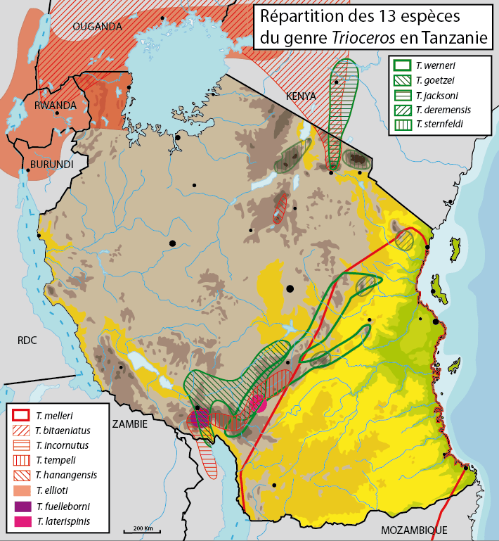 Le genre Trioceros compte 40 espèces, toutes africaines. Sur ces 40 espèces, 13 sont présentes en Tanzanie et 7 sont endémiques à la Tanzanie.