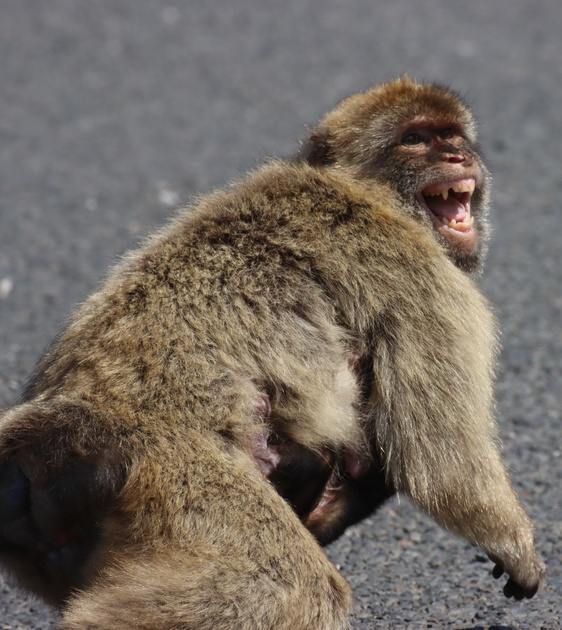 Remarquer l’absence de queue, les doigts courts et le pelage extrêment fourni, autant d’adaptation au froid (Gibraltar ; août 2024).