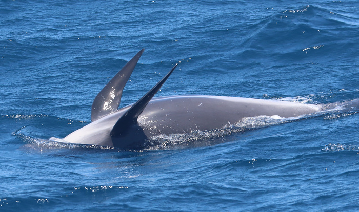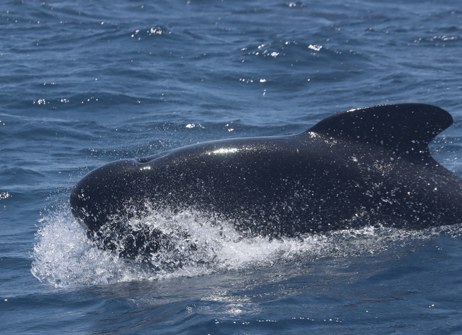 Noter la longueur de la nageoire pectorale. Celle du globicéphale tropical est plus courte (Gibraltar ; juillet 2024).
