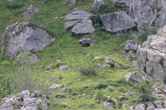 Cet ours circule sur le flanc de la montagne. Il disparait dans un bosquet un quart d’heure puis est bien visible en prairie un quart d’heure, puis disparaît à nouveau derrière un buisson où il va se reposer deux heures…