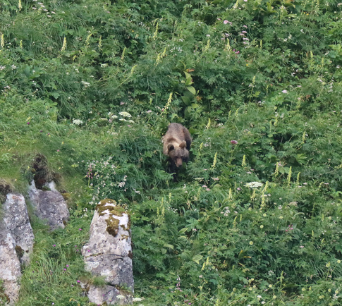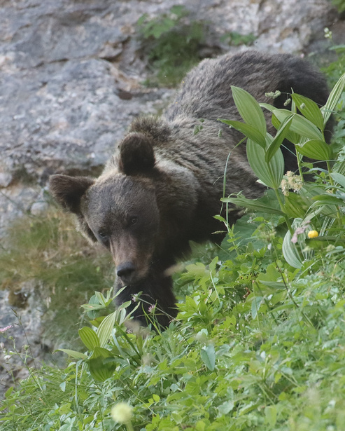 Le mois de juillet n’est pas très favorable pour voir les ours. Ils sont déjà en phase d’hyperphagie mais il n’y a pas grand chose de très nourrissant en début d’été. Ce jeune ours mangent surtout les apiacées (ombellifères). Les grandes fleurs blanches sur la photographie.