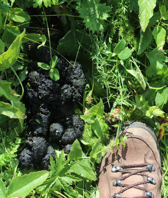 On peut, au passage, repérer des indices de présence : crottes (photo ci-contre) ; empreintes… mais ces indices sont difficiles à exploiter.