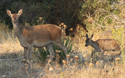 – le cerf élaphe (Cervus elaphus) photo en haut à droite : il représente 37% des observations de cervidés en Espagne où il est beaucoup plus facile à voir qu’en France. C’est une sous-espèce propre à la péninsule ibérique (Cervus elaphus hispanicus). Sa morphologie est plus svelte et ses bois plus fins que la sous-espèce d’Europe centrale : Cervus elaphus hippelaphus.