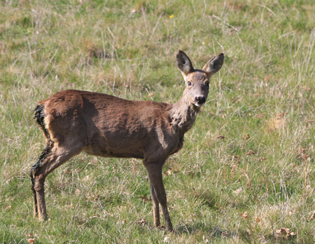 Cette chevrette s’est figée après avoir remarqué ma présence. La sortie de l’hiver (début mars ici) est assez favorable pour voir les chevreuils. Ils ont faim et l’herbe repousse. Ils sont donc plus souvent à découvert. Par contre, les chevreuils ne sont pas très beaux à cette période.