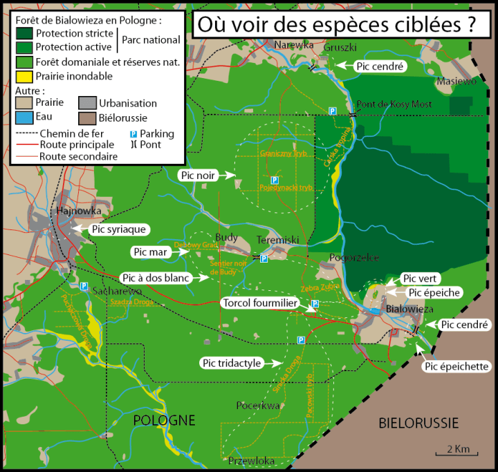 Si la zone de protection stricte du parc national de Bialowieza est une des meilleures de la forêt pour observer les pics, son coût et l’interdiction de sortir du sentier représentent des inconvénients importants. Si vous choisissez cette option, demandez bien un guide ornithologue (il y en a même qui se présentent comme spécialistes des pics).